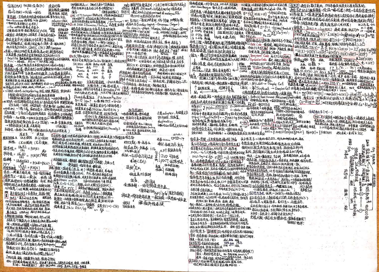五门必修的期末考试,四门是实打实的生医专业课,都需要准备cheat sheet。而《信息与生命》和《生物医学检测原理与传感技术》的期末考试,简直就是在考你能把多少东西从PPT里抄到那两面A4纸上。对于这两门课我抱怨颇多,首先就是我上课从没认真听过,也不觉得这种花四课时速成信号与系统之类的操作有什么用处——学过的不屑于听,不会的还是不会。然后大作业的设置,信生稍好一些,至少给出了选项和必要的说明,检测传感根本就是无中生有。我记得在实验室里偶遇腾老师,他问我手里的设备是不是课上发的,我说都是自己买的,课上什么都没给,老师说,那至少给你们经费了是吧。我emmmmm有道理哦难道这么无中生有就是生医磕盐的常态吗?最后,这种既有大作业又有考试的设置根本就是无故增加学生负担,两份大作业和抄PPT一般的考试更是离谱中的离谱。(下图是一张A4 note)